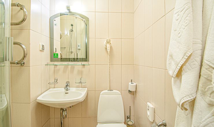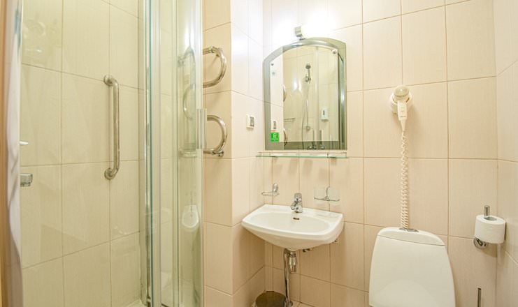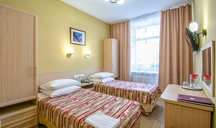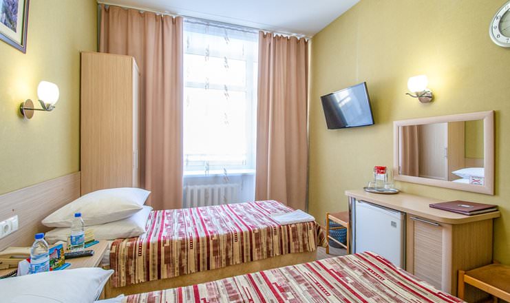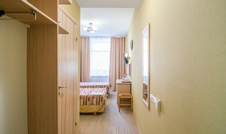 Площадь номера - 15 кв.м. 2 осн. места. 1 доп. место. Балкон. Мебель: вешалка, зеркало, кровати односпальные, прикроватные тумбочки, стол, стулья, шкаф. Оборудование: телевизор, телефон, холодильник, чайный набор посуды, электрочайник