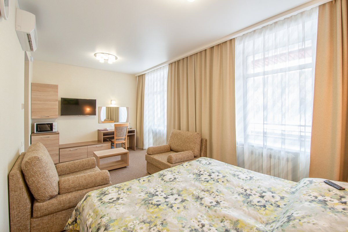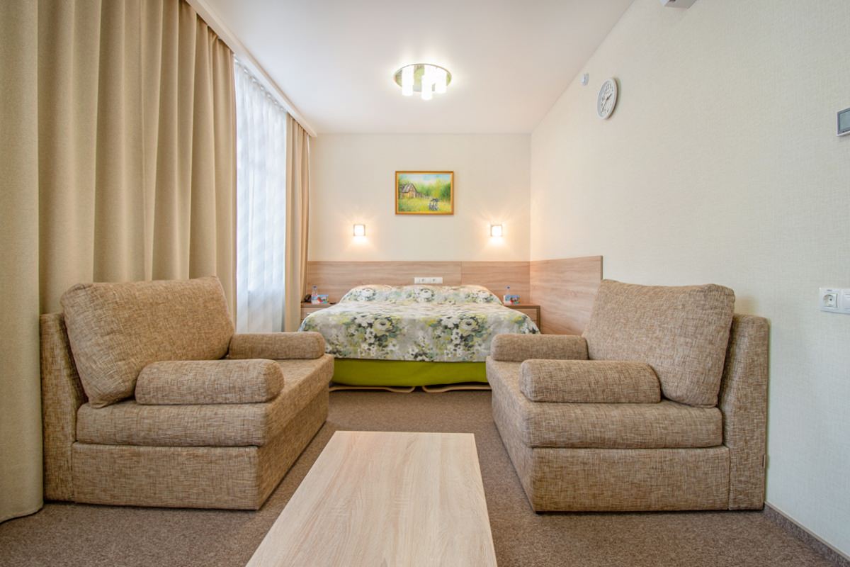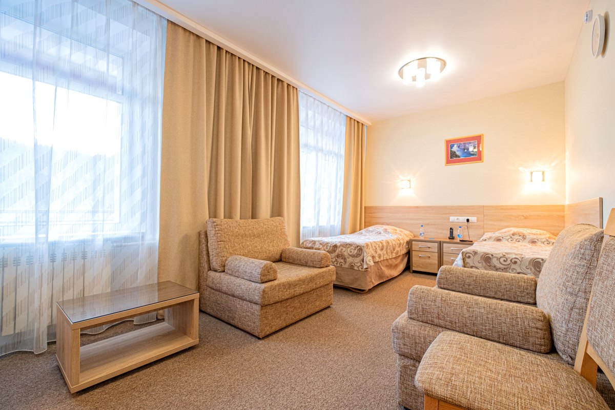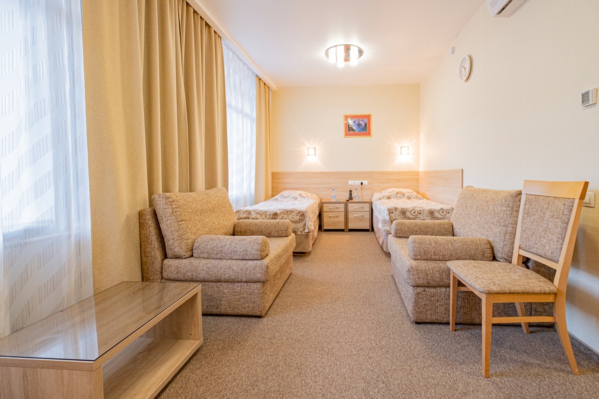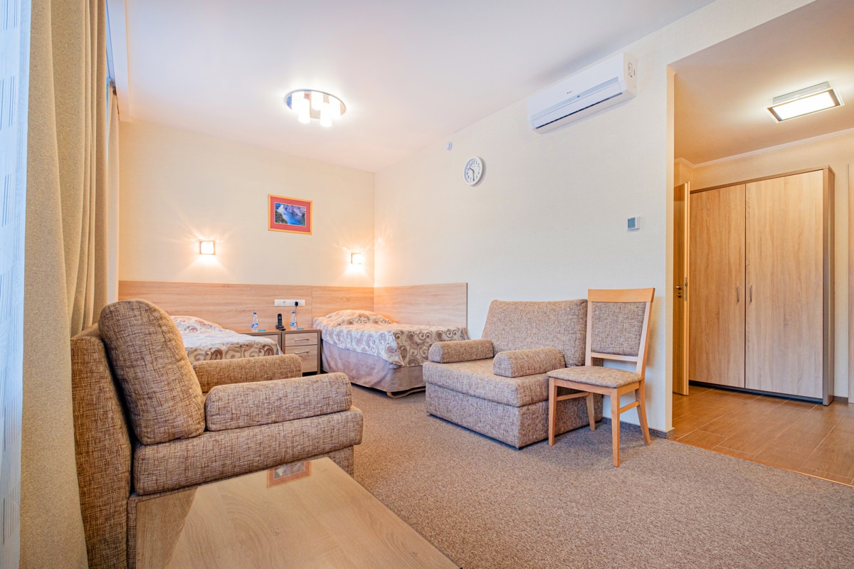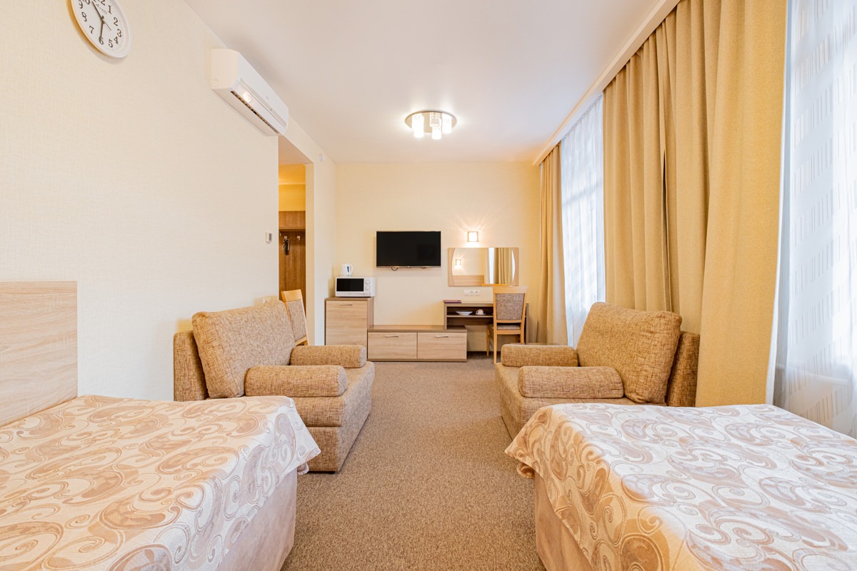 Площадь номера - 27 кв.м. 2 осн. места. 1 доп. место. Балкон: с мебелью, с сушилкой. Мебель: зеркало, кресло-кровать, кровати односпальные, прикроватные тумбочки, стол (рабочий), стулья, шкаф. Оборудование: кондиционер, набор посуды, телевизор ЖК, телефон, холодильник, электрочайник. Санузел: биде, с ванной или душевой кабиной, туалетные принадлежности, фен. Сервис: Wi-Fi бесплатно, смена полотенец, смена постельного белья, уборка номера.