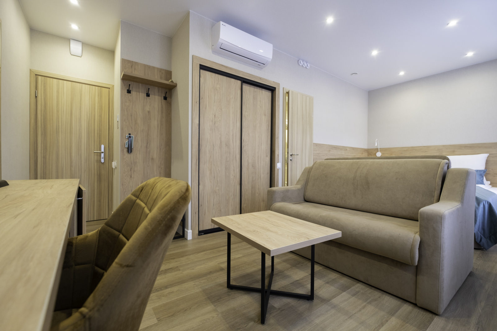Площадь номера - 25 кв.м. 2 осн. места. 2 доп. места. Мебель: диван раскладной, кровать двуспальная, прикроватные тумбочки, стол, столик журнальный, стул, шкаф. Оборудование: кондиционер, телевизор, телефон, холодильник, чайный набор посуды, электрочайник. Санузел: биде, с душем, тапочки, туалетные принадлежности, фен, халат. Сервис: Wi-Fi бесплатно, смена полотенец, смена постельного белья, уборка номера.